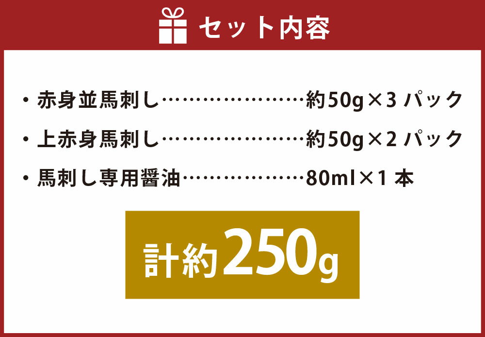 【ふるさと納税】国産 赤身 馬刺し 2種セット 専用醤油付き(80ml×1本) 赤身並馬刺し×3パック・上赤身馬刺し×2パック 計約250g(約50g×5パック) 馬刺 馬肉 お肉 しょうゆ 詰め合わせ 冷凍 熊本県 上天草市 送料無料