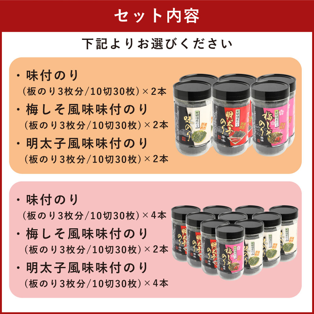 【ふるさと納税】<選べる内容量>有明海柳川産 海苔詰め合わせ 3種類セット 計6本・計10本 味付のり・梅しそ風味味付のり・明太子風味味付のり 1本あたり板のり3枚分/10切30枚 のり 味のり 味付け海苔 有明海苔 ウメ めんたいこ おにぎり 国産 福岡県 うきは市 送料無料