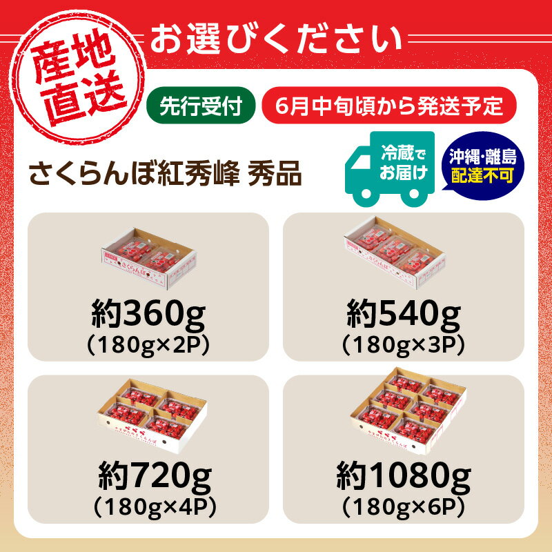【ふるさと納税】063-006【2026年度先行受付】★さくらんぼ紅秀峰★秀品 選べる内容量(360g~1080g) 【6月より順次発送予定】 さくらんぼ 大粒 紅秀峰 フルーツ 果物 山形 濃厚 紅色 果汁 甘い 人気 大江町 ふるさと納税 秀品