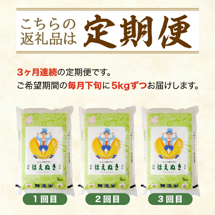 - 【ふるさと納税】≪3ヶ月定期便≫ 無洗米 はえぬき 5kg×3ヶ月連続 計15kg 山形県産 毎月下旬にお届け 酒田市 お米 精米 白米 連続定期便 簡単 手軽 東北食糧 BG無洗米 HACCP