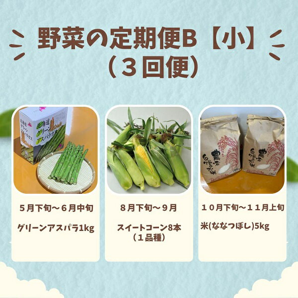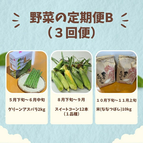 - 【ふるさと納税】 野菜 定期便 Bセット 3ヶ月 ≪令和8年産予約受付!≫ 送料無料 | アスパラ アスパラガス とうもろこし とうきび スイートコーン ななつぼし 3回 米 新米 北海道 北海道美瑛 北海道美瑛町 美瑛町 美瑛産野菜 野菜の定期便 サスケの家 定期便[041-11]