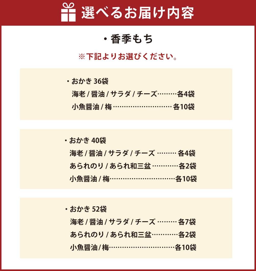 - 【ふるさと納税】<選べる内容量>【シャトレーゼ】香季もち 計36袋 計40袋 計52袋 香季もち(醤油・サラダ・海老・チーズ・小魚醤油・梅)・あられ(あられのり・あられ和三盆) おかき あられ せんべい 詰め合わせ 冷蔵 山梨県 中央市 送料無料