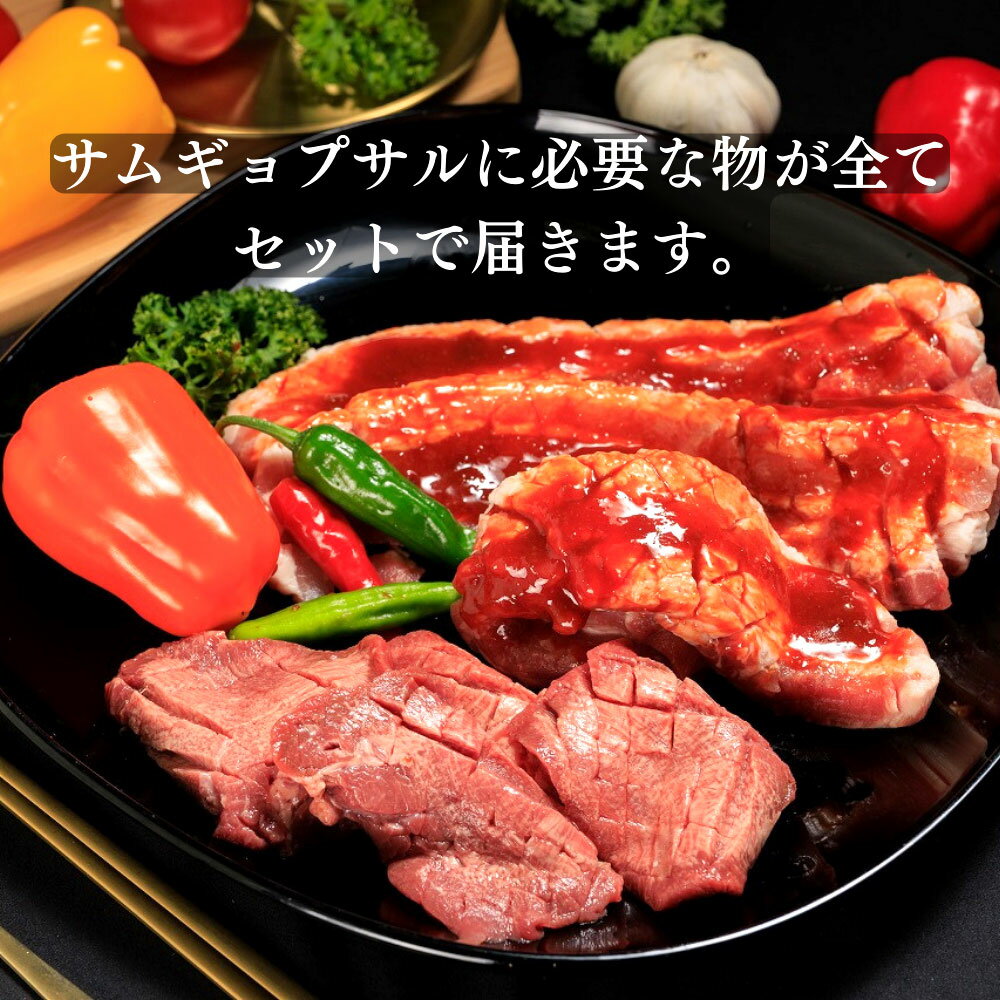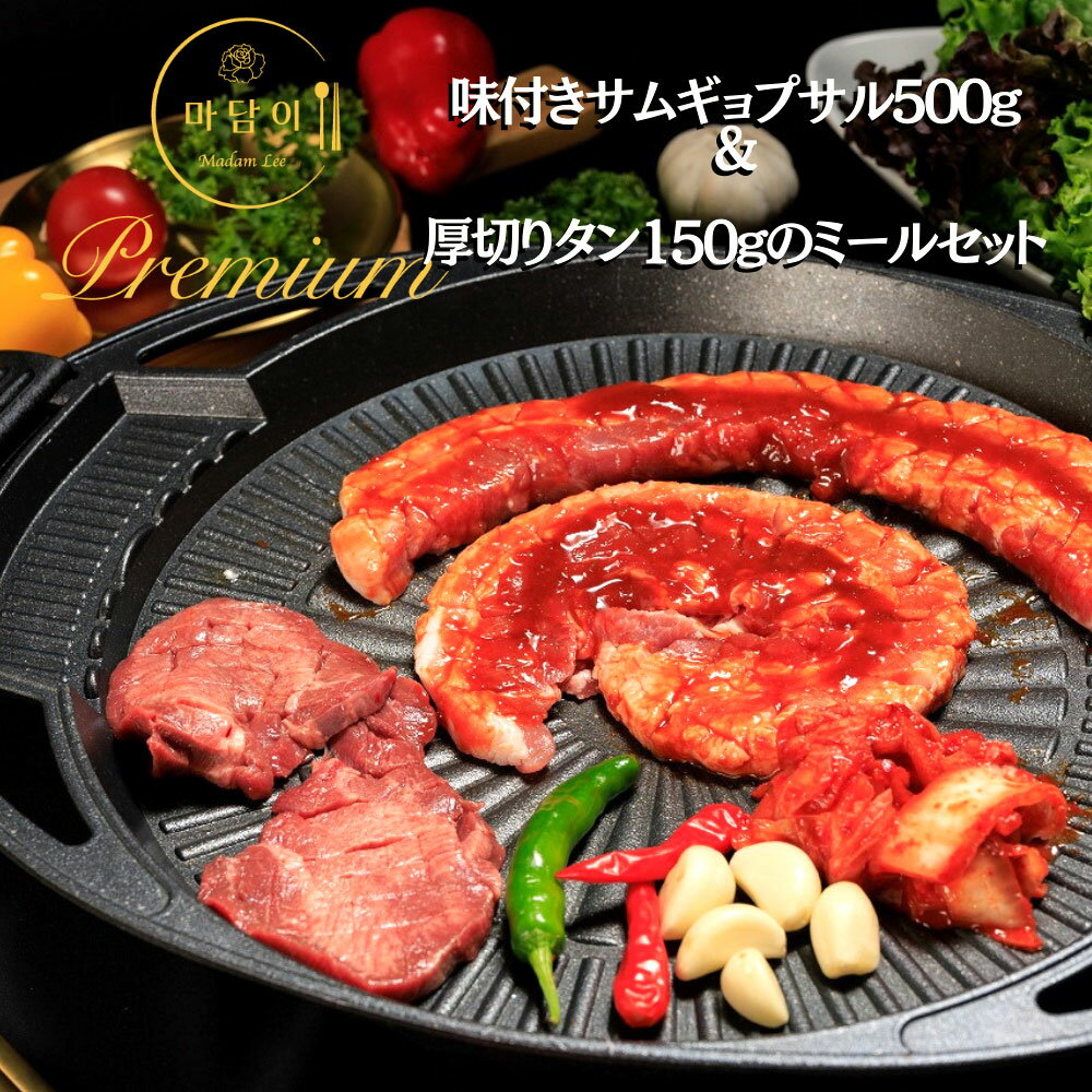 【ふるさと納税】味付き 花咲サムギョプサルと厚切り牛タン PREMIUMセット 【Madam Lee PREMIUMシリーズ】サムギョプサル約500g 牛タン約150g スパイスソルト約10g 自家製 極上 壺漬けキムチ約200g サムジャン約30g ニンニク お肉 韓国グルメ 冷凍