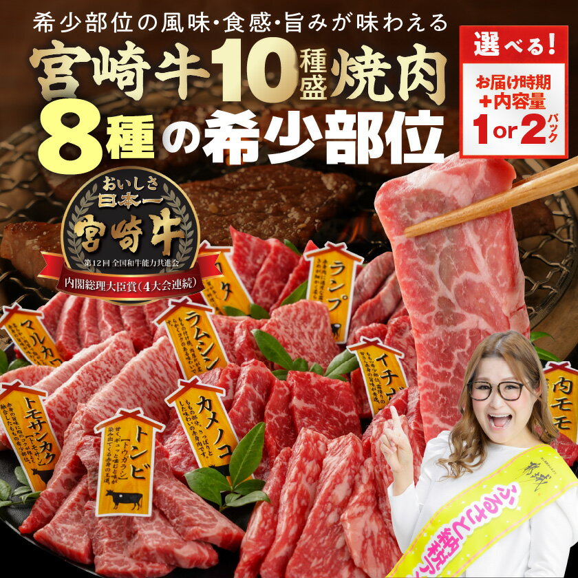 - 【ふるさと納税】【セット内容&発送時期が選べる!】宮崎牛食べ比べ10種盛り焼肉セット - 希少部位入り A4以上 各60g 約600g×1P/約600g×2P 翌月お届け/14日以内にお届け 贈答用 赤身肉 国産牛 送料無料 SKU-3104【宮崎県都城市は2年連続ふるさと納税日本一!】