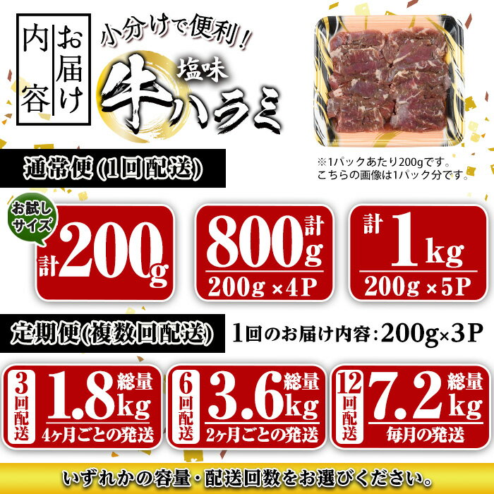 - 【ふるさと納税】< 内容量 ・ お届け回数が選べる >塩味 牛ハラミ (計200g-7.2kg:1・3・6・12回) 定期便 小分け 牛肉 肉 ハラミ 牛はらみ 味付け 焼肉 塩 BBQ 冷凍 大分県 佐伯市【DH297・DH298・DH299・DH324・DH325・DH326】【ネクサ】