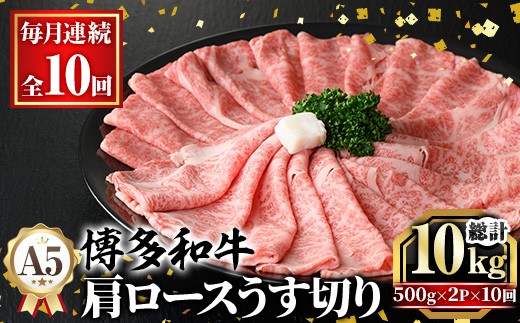 ≪毎月定期便・全10回≫A5等級 博多和牛肩ロースうす切り(総計10kg・500g×2P×10回) 牛肉 肉 国産 和牛 博多和牛 肩ロース カタロース うす切り スライス すき焼き すき焼 しゃぶしゃぶ 薄切り黒毛和牛 コンシェルジュ 冷凍 定期便 頒布会【久田精肉店】 as23-049