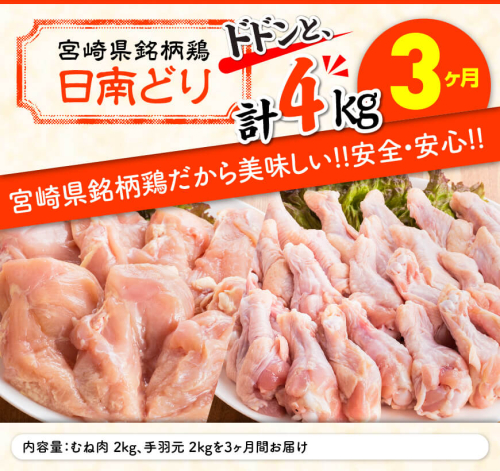 - 【3ヶ月定期便】宮崎県産若鶏 日南どり むね肉&手羽元 計4kg(各2kg×1) 【 ふるさと納税 鶏肉 鶏 若鶏 むね 手羽元 セット 宮崎県産 川南町 おうち時間 おうちごはん 定期便 送料無料 】