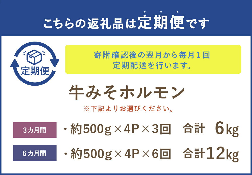 【ふるさと納税】<選べる定期便> 牛みそホルモン 計約2kg(約500g×4パック) 3回 6回 1回あたり4パック 3ヶ月 6ヶ月 計約6kg 計約12kg 肉 お肉 にく おにく 牛みそ 牛味噌 ホルモン 牛大腸 濃厚 味噌ダレ 肉厚 冷凍 熊本県 あさぎり町 送料無料