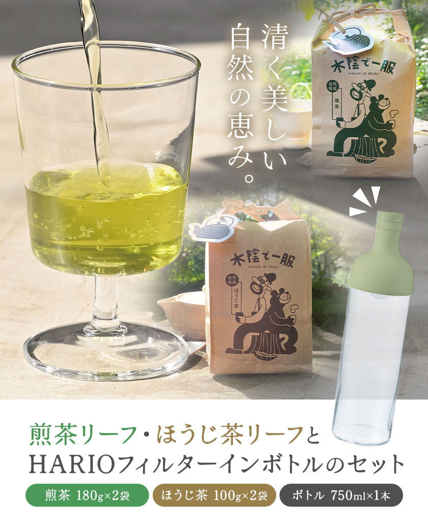 - 【ふるさと納税】茶 自然栽培茶 煎茶リーフ ほうじ茶リーフ の HARIO (ハリオ) フィルターインボトル の セット 計4袋 + 1本 合同会社原田山業《90日以内に出荷予定(土日祝を除く)》 熊本県 菊池市 煎茶 ほうじ茶 茶葉 ボトル付き 自然栽培 水出し フィルター ボトル