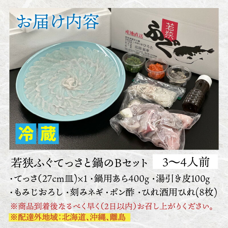 - 【ふるさと納税】【冷蔵でお届け】 若狭ふぐ てっさ と 鍋Bセット 3〜4人前| お歳暮 海鮮 養殖 養殖魚 産地直送 民宿 旅行 旅 体験 海鮮 食品 魚介 魚 ふぐ 【配送不可地域:北海道・沖縄・離島】 [BFBQ007]