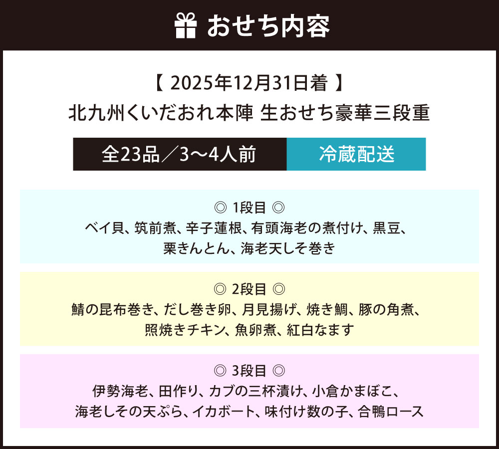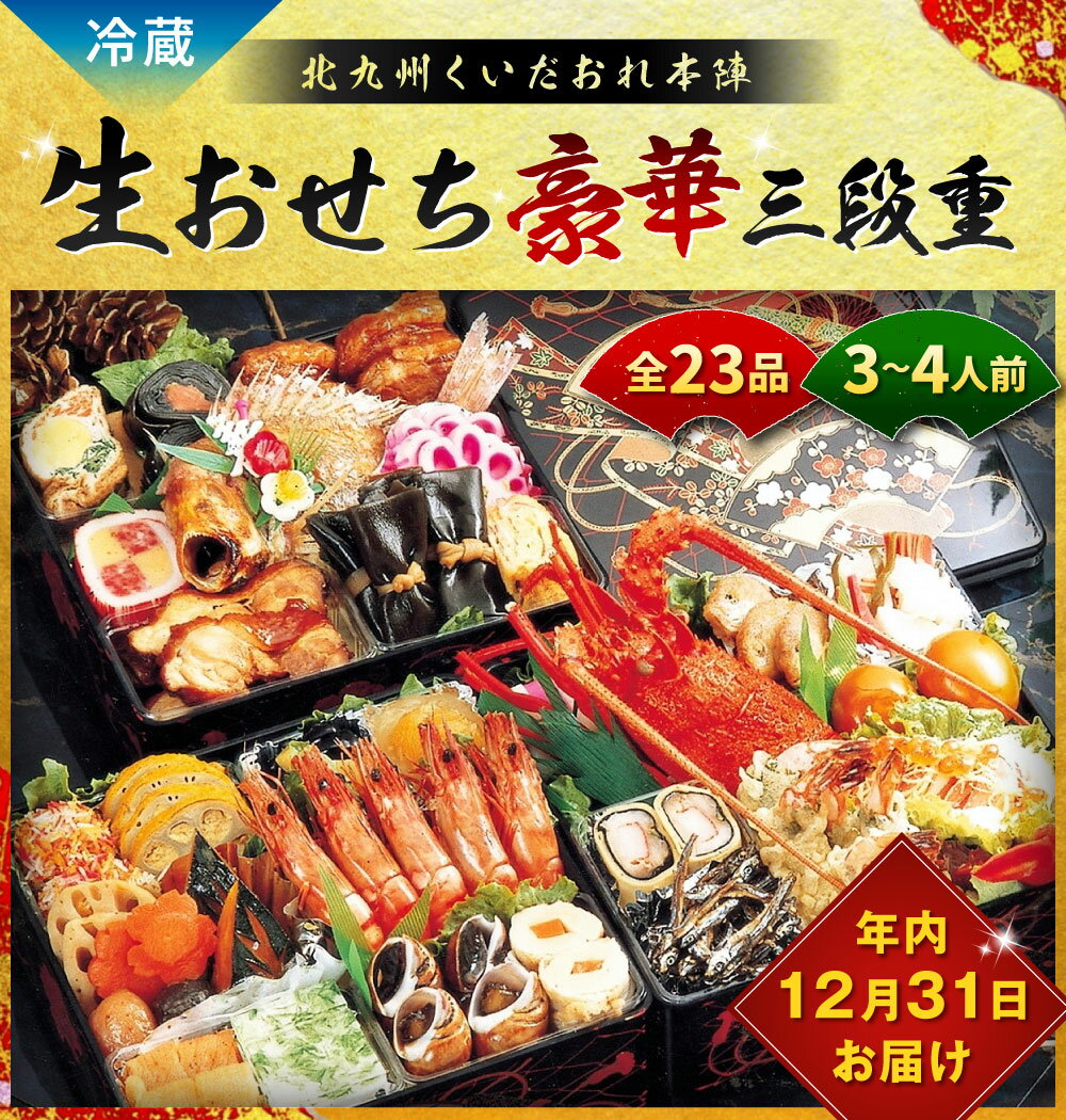 【ふるさと納税】【2025年12月31日着】冷蔵 生おせち 豪華 三段重 《北九州くいだおれ本陣》3~4人前 全23品 冷蔵おせち 正月 新春 新年 御節 年内 大晦日 特別 イベント 和風 予約 福岡県北九州市