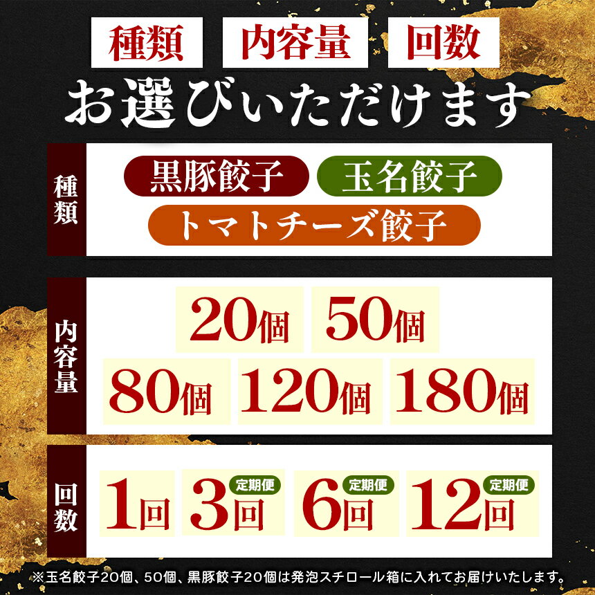 - 【ふるさと納税】選べる種類 『 玉名餃子 』or『黒豚餃子』 or 『トマトチーズ餃子』 選べる容量 20個 or 50個 or 80個 or 120個 or 180個 (1回・3回・6回・12回) | 餃子 黒豚 トマトチーズ トマト ぎょうざ つまみ お手軽 小分け 冷凍 冷凍食品 おかず 豚肉 熊本県 玉名市