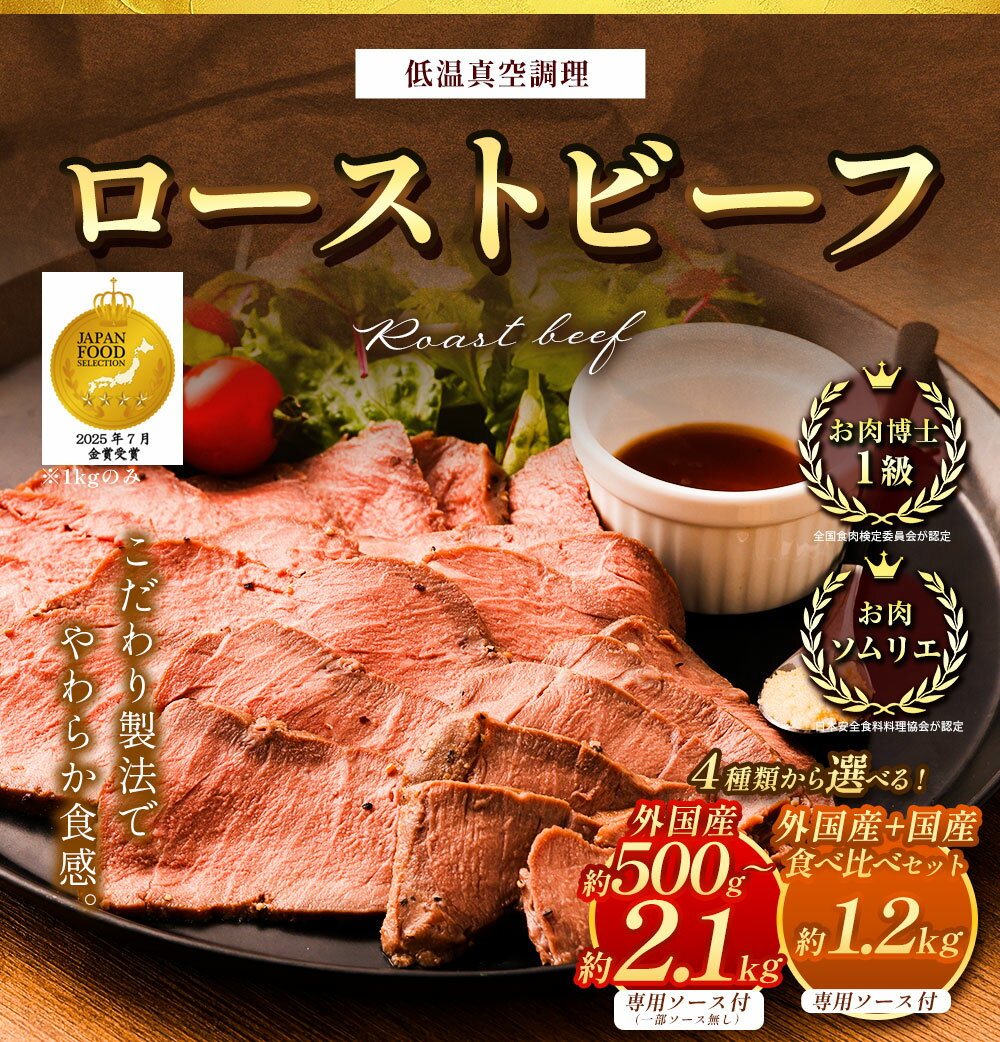 【ふるさと納税】<選べる4種類> ローストビーフ 低温真空調理 500g ~ 2.1kg 5000円 ~ 18000円 5000円 ~ 1万8000円 外国産 または 外国産+国産 食べ比べセット ソース付 牛肉 真空熟成 ローストビーフ丼 西洋わさび 内もも肉 もも肉 送料無料「500g:ソースなし」