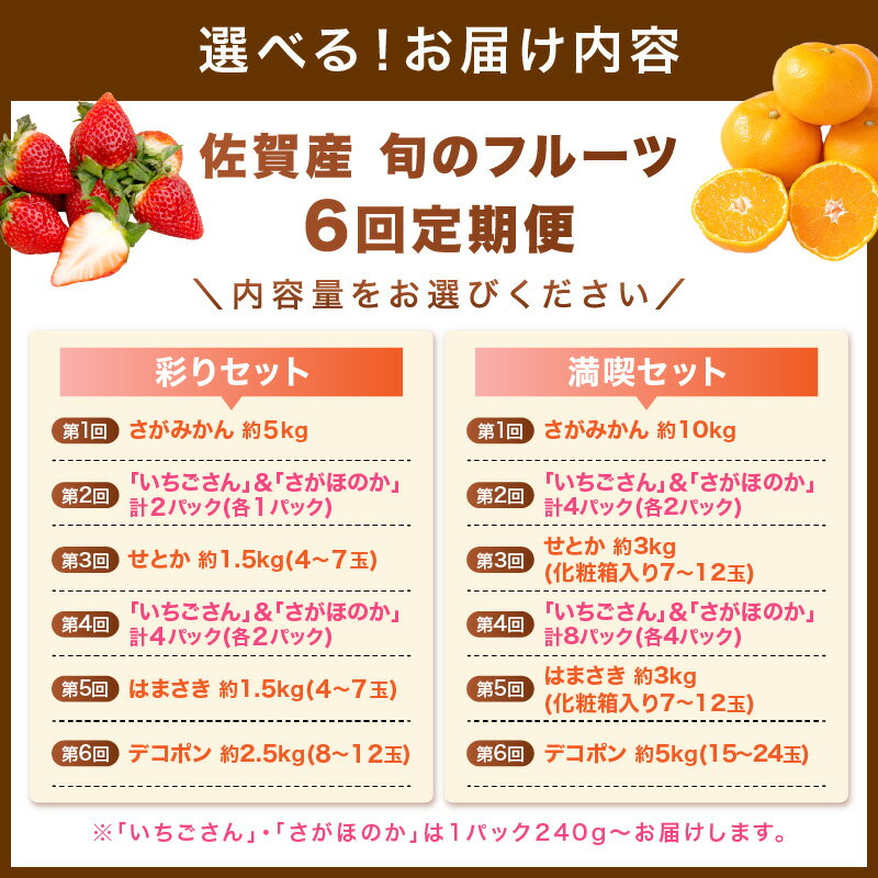 - 【ふるさと納税】佐賀産 旬のフルーツ定期便【全6回】 柑橘 いちご<内容量が選べる/彩りセット・ 満喫セット> 【 果物 みかん 蜜柑 オレンジ かんきつ 苺 いちごさん さがほのか ふるさと納税 フルーツ 】