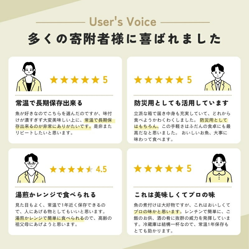 さば、ぶり、いわしの和風煮魚詰合せがもらえます。国産魚を使用し、骨まで柔らかく煮込んだ贅沢な味わいが特徴です。さばの味噌煮、いわしの生姜煮、ぶり大根、ぶり生姜煮の4種類がセットになっており、常温保存が可能で非常食や常備食としても便利です。湯煎で3分で簡単に調理でき、忙しい日々の食卓にぴったり。ギフト箱やダンボールでの配送が選べ、家庭用にも贈り物にも最適です。