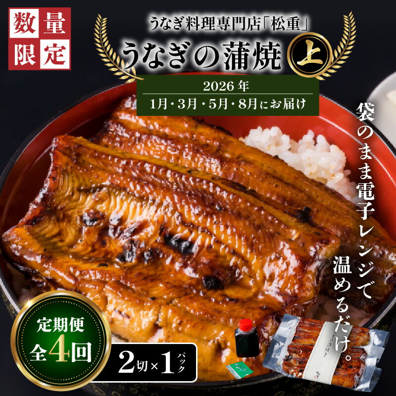 【ふるさと納税】 全4回 定期便 うなぎ料理 専門店 松重 まつじゅう 【 上 】 うなぎ 蒲焼 2切(1尾)× 1パック 【1・3・5・8月お届け】 鰻 ウナギ うな重 うな丼 ひつまぶし たれ 土用 丑の日 数量 期間 限定 鹿児島 おすすめ ランキング プレゼント ギフト