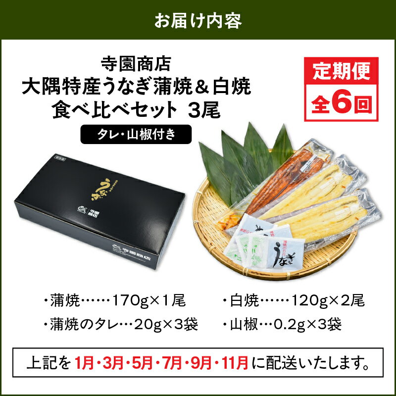 - 【ふるさと納税】【 定期 6回 】 大隅特産 うなぎ蒲焼 1尾 170g 白焼 2尾 240g 食べ比べ セット うなぎ 鰻 蒲焼 蒲焼き 惣菜 総菜 定期便 魚 魚貝類 魚介類 海産物 鰻重 うな重 ひつまぶし 鰻丼 土用の丑 冷凍 寺園商店鹿児島 鹿屋市 おすすめ ランキング プレゼント ギフト
