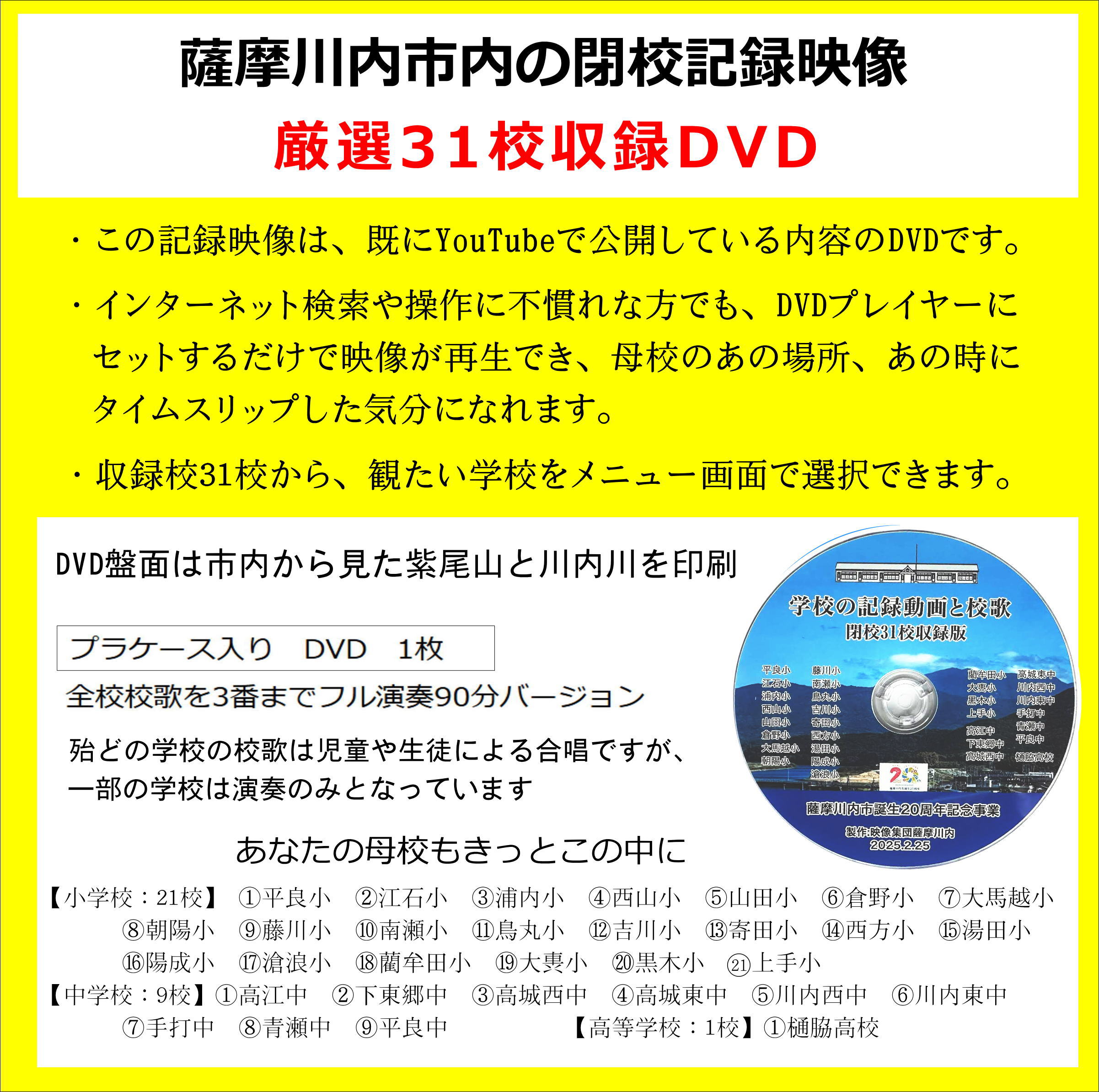 【ふるさと納税】薩摩川内市誕生20周年記念 閉校記録映像厳選31校収録DVD 映像集団薩摩川内 鹿児島 薩摩川内市 DVD YouTube 学校 小学校 中学校 高校 高等学校 高歌 校舎 グラウンド 卒業 卒業写真 青春 地域 歴史 ふるさと 母校 郷土 薩摩川内市20周年 映像 保存版