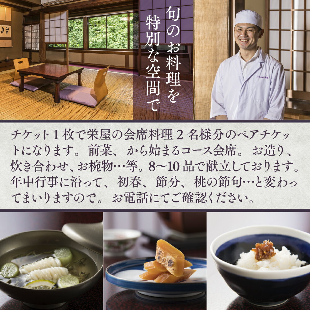 【ふるさと納税】日本料理 栄屋 お食事券 会席料理 2名様分 ペア ペアお食事券 ペア券 お食事券 食事券 金券 チケット 旅館 日本料理 和食 老舗 料亭 旅行 観光 逸品 グルメ ご当地 ギフト お祝い デート 記念日 退職祝い 結婚記念日 カップル 夫婦 利用券 送料無料 RY001