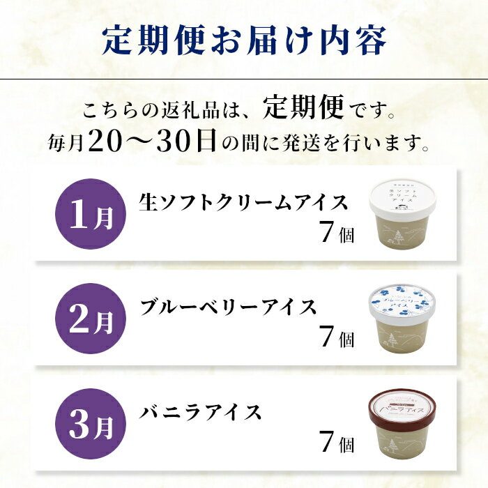 【ふるさと納税】 全3回★3種類のアイス定期便☆2026年1月発送〜 南信州根羽村産アイス が毎月7個届く! 合計21個 アイス アイスクリーム 定期便 生ソフトクリームアイス バニラアイス ブルーベリー 果物 ジャム 長野県 根羽村 ソフトクリーム スイーツ 15000円 15,000円