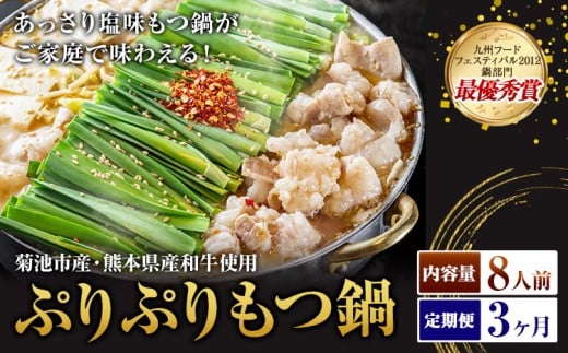 - 九州鍋グランプリ受賞 ぷりぷりもつ鍋 8人前 3ヶ月定期便 有限会社味万(万彩工房)《お申し込みの翌月から出荷》 菊池市産・熊本県産和牛使用 モツ鍋 鍋セット セット モツ 牛丸腸 無添加スープ ちゃんぽん麺 薬味付き 送料無料