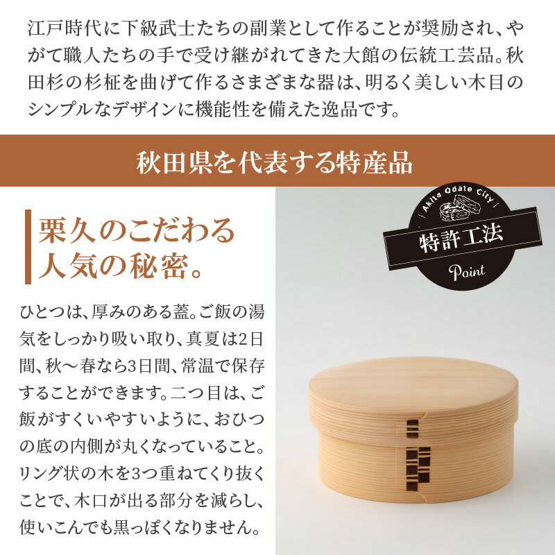 - 【ふるさと納税】曲げわっぱ おひつ 2合 日本製 木製 円錐形 美しい木目 秋田杉 厚みのある蓋 伝統工芸品 無塗装 シンプル 軽量 キッチン用品 特別な日 国産 栗久 特産品 お取り寄せ 東北 秋田県 大館市 送料無料
