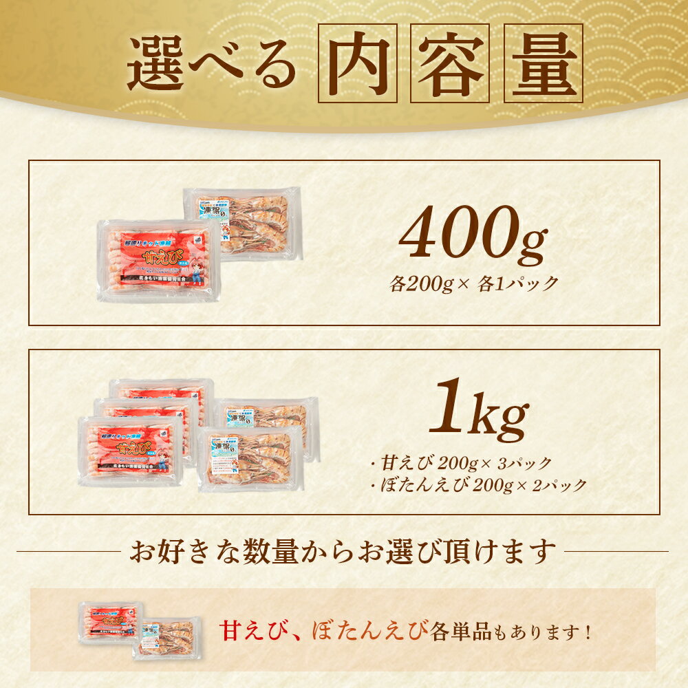 【ふるさと納税】【選べる内容量400g or 1kg】超速リキッド凍結でドリップゼロ!北海道羽幌産甘えび・ぼたんえびセット|甘えび ぼたんえび 小分け エビ 海老 甘えび丼 甘エビ 甘海老 ぼたんえび ぼたん海老 冷凍 魚介類 刺身 丼 北海道 羽幌町 羽幌 ふるさと納税【0311701】