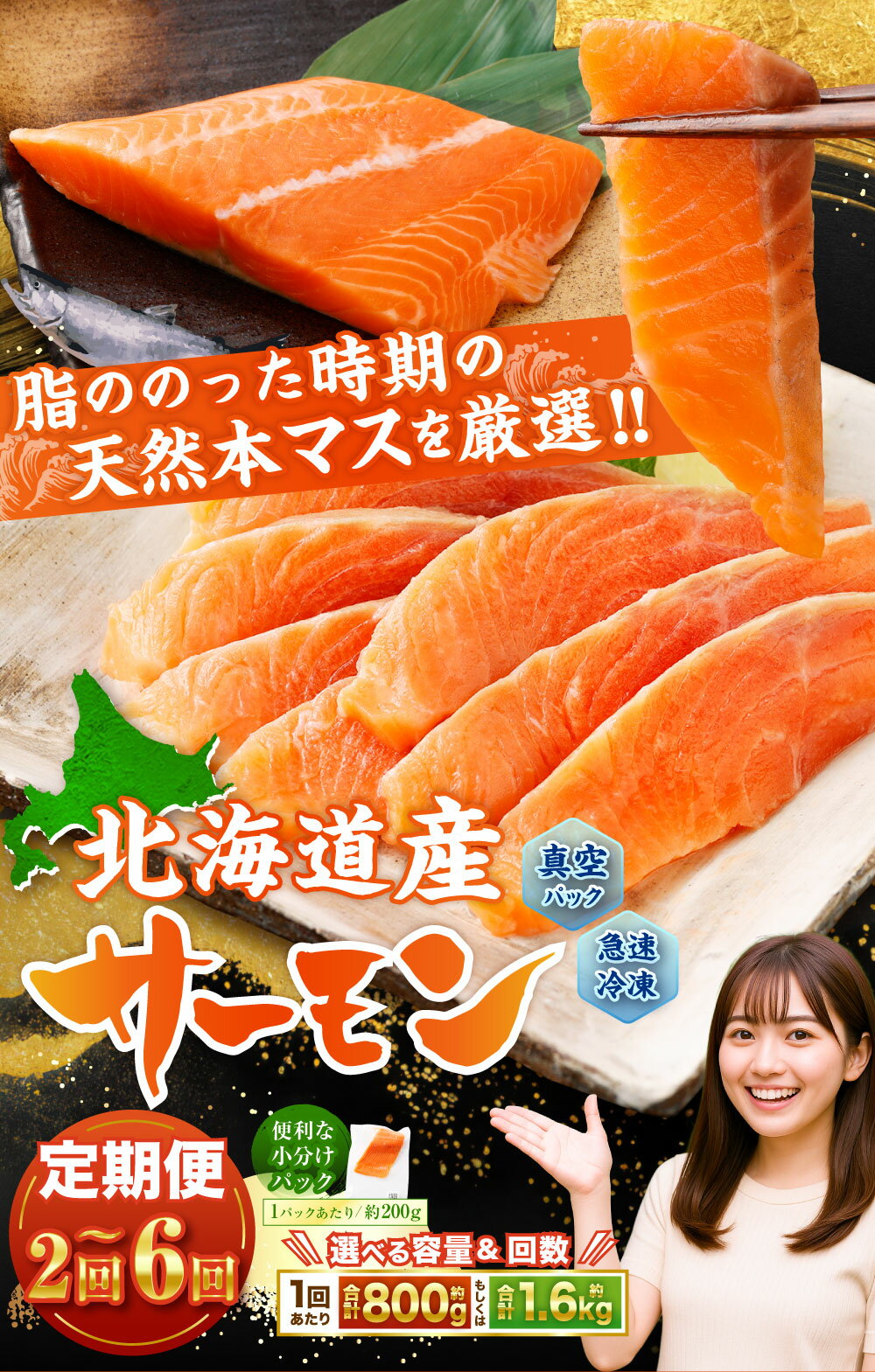 - 【ふるさと納税】 【選べる容量】 【選べる定期便】 北海道産 サーモン <約800g (約200g×4パック) / 約1.6kg (約200g×8パック)> (2~6回) 鮭 さけ 魚 さかな 海鮮 魚介 海の幸 小分け 定期便 国産 小樽市 北海道 冷凍 送料無料