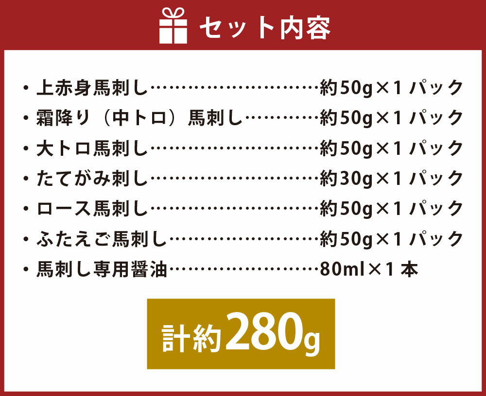 - 【ふるさと納税】国産 6種 馬刺し 食べ比べセット 計約280g 専用醤油付き(80ml×1本) 上赤身・霜降り(中トロ)・大トロ・たてがみ・ロース・ふたえご 計6パック 各1パック 馬刺 馬肉 お肉 しょうゆ 詰め合わせ 冷凍 熊本県 上天草市 送料無料