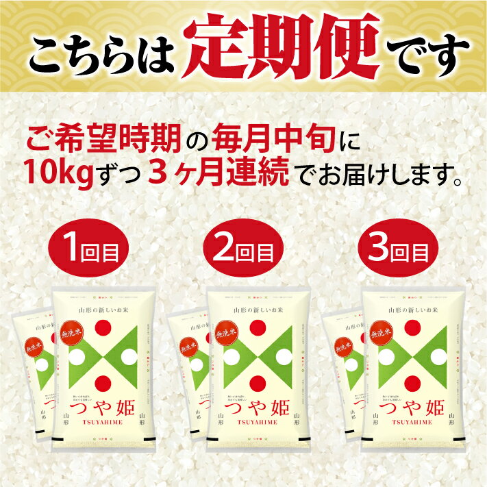 【ふるさと納税】≪3ヶ月定期便≫ 無洗米 つや姫 10kg×3ヶ月連続 計30kg 各月5kg×2袋 山形県庄内産 毎月中旬にお届け 東北 山形県 遊佐町 庄内地方 庄内平野 庄内米 精米 白米 米 お米 ブランド米 ごはん ご飯 連続定期便 3回連続