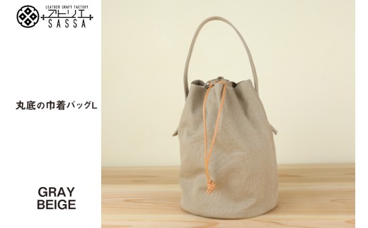 - バッグ 丸底の巾着バッグ グレーベージュ L [アトリエSASSA 富山県 朝日町 34310192] 丸底 巾着 鞄 かばん カバン 帆布 革 おしゃれ 手作り シンプル レザー