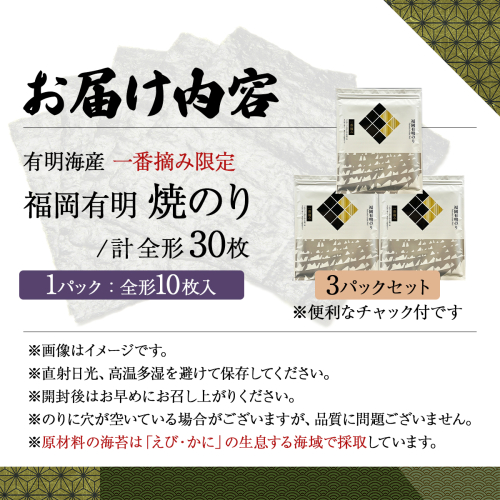 【有明海産一番摘み限定】福岡有明のり(焼のり)全形30枚(10枚×3P)【チャック付・賞味期限1年】