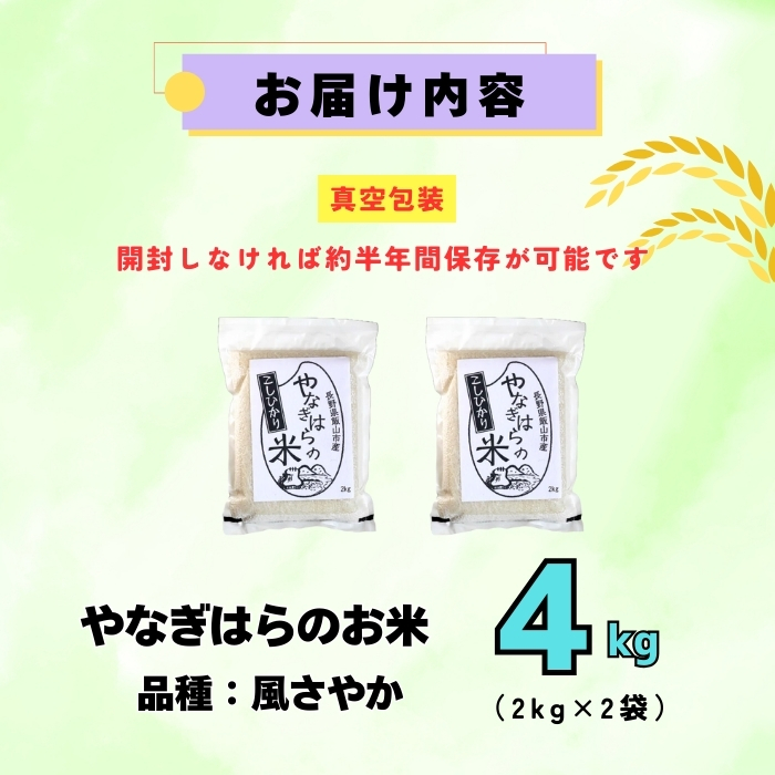 - 【先行予約】<令和7年産新米>特別栽培米 「やなぎはらの米 風さやか」4kg(真空包装) (7-70)