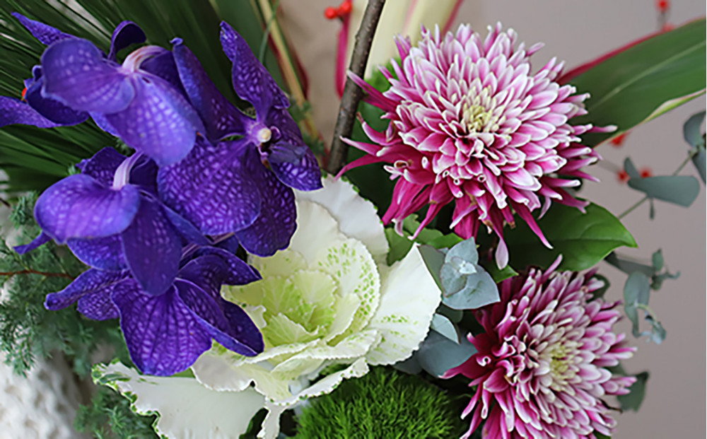 - 678.素敵に飾れるお正月ブーケセット【紫紺】――紫紺の蘭で迎える新年。華やかなお正月ブーケ(ガラスベース付き) 313726_BC034