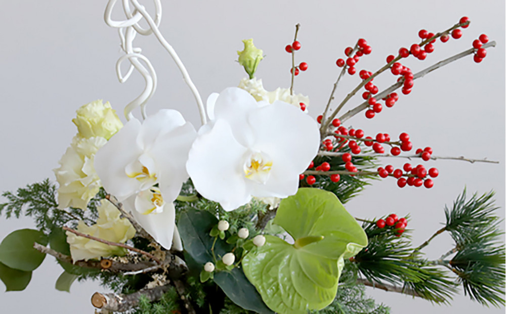 679.素敵に飾れるお正月ブーケセット【紅白】――胡蝶蘭で迎える特別な新年。縁起の良い紅白カラーのお正月ブーケ(ガラスベース付き) 313726_BC035