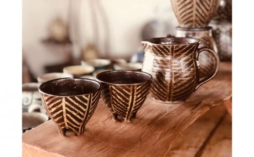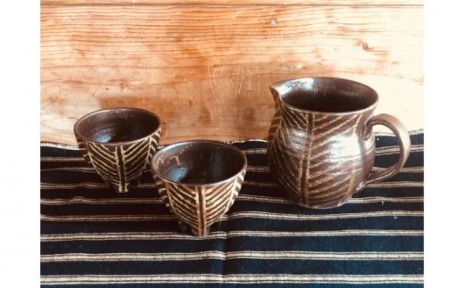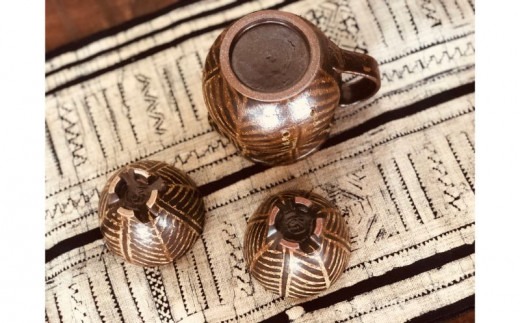 - <南陶窯>ピッチャー&四つ足カップ(ミニ2個)セット【灰釉・線紋】 ☆ やちむん 久場政一 読谷村 沖縄 エスニックテイスト セット