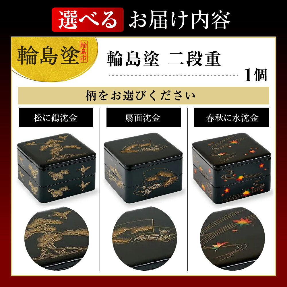 - 【ふるさと納税】輪島塗 二段重 ( 選べる柄 : 松に鶴沈金 / 扇面沈金 / 春秋に水沈金 ) | お重箱 漆器 輪島塗 漆塗り 伝統工芸 沈金 加飾 模様 金 木製 和食 食器 お正月 おせち オードブル ギフト プレゼント 贈り物 能登 石川県 輪島市