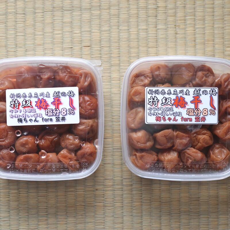 - 【ふるさと納税】特級 無添加 減塩 梅干しセット 越の梅 520g 2パック( 国産塩 使用 260g × 1パック / 笹川ながれの塩 使用 260g × 1パック )こだわりの塩使用 新潟県糸魚川 白梅 梅ちゃんfarm笠井 うめぼし 塩分8% カメを使った熟成 すっぱい梅干し 梅本来の味わい