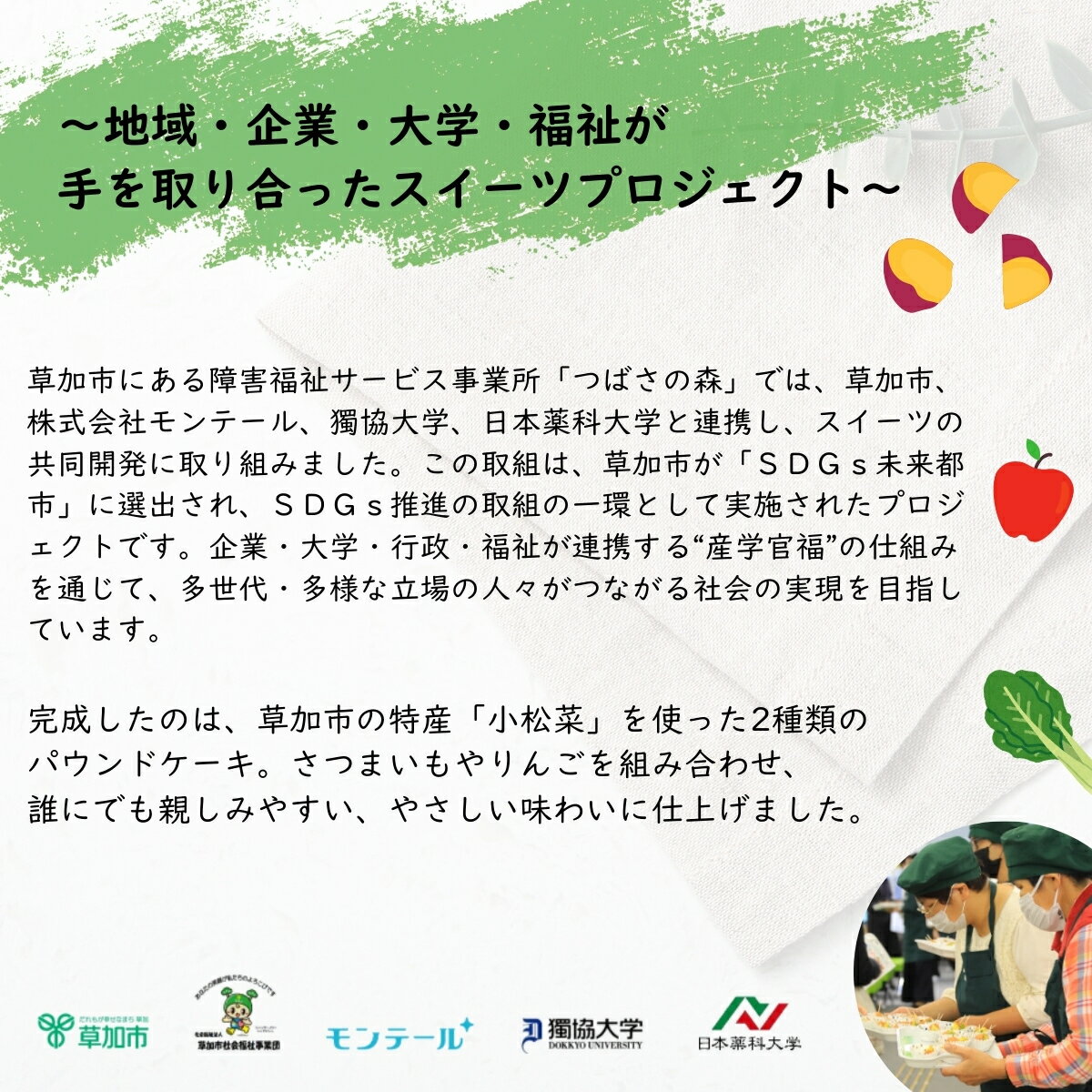 - 【ふるさと納税】つばさの森 手作り焼き菓子詰合せ 9個 | パウンドケーキ 焼き菓子 焼菓子 さつまいも りんご 小松菜 スイーツ 贈答 プレゼント 就労支援 手作り コラボ モンテール 獨協大学 日本薬科大学 共同開発 つばさの森 埼玉県 草加市