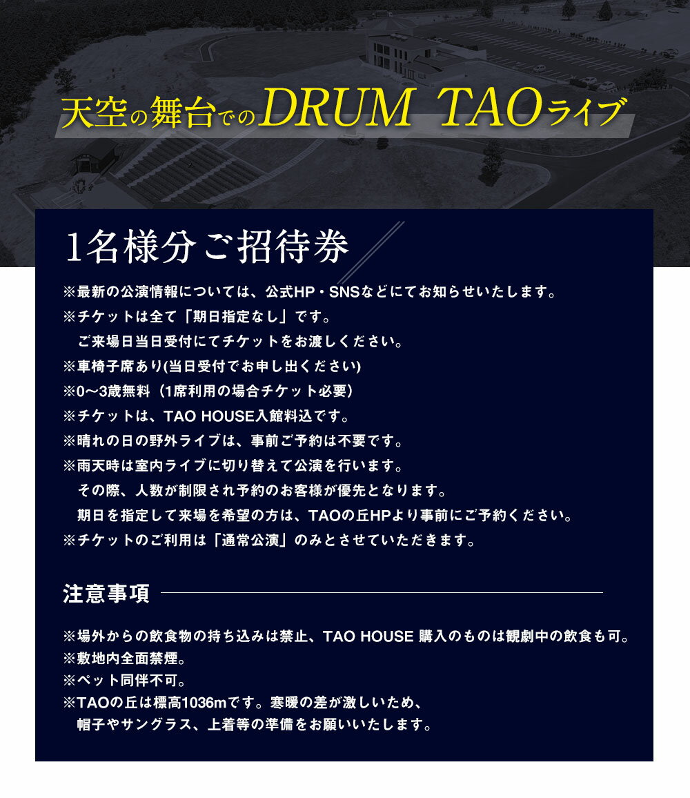 【ふるさと納税】 【野外劇場TAOの丘】ふるさと納税限定 チケット 1名様分!! ドラムタオ DRUM TAO 竹田市 大分県 チケット 野外劇場 公演 送料無料 【2025年公演チケットお申込日より順次発送】