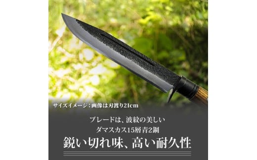 - 土佐鍛 ハンティングナイフ 210 ダマスカス15層青2鋼 両刃 | ナイフ キャンプ アウトドア 打刃物 土佐 鉈 剣鉈 なた 職人 山林 狩猟 熊 刃物 薪割り ハンドメイド 釣り 伝統 工芸 高知県 南国市