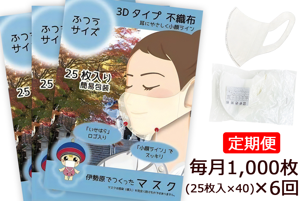 - [定期便] 事業所向け [伊勢原でつくったマスク] ふつうサイズ 簡易包装25枚入り×40パック(合計1000枚)×6回 (毎月1回発送/6回合計6000枚) ※「いせはら」刻印入り [0051]