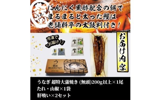 - 【数量限定】鹿児島県産!秘伝の特上スタミナうなぎ超特大蒲焼き1尾<200g以上!>肝吸い付き! a1-150