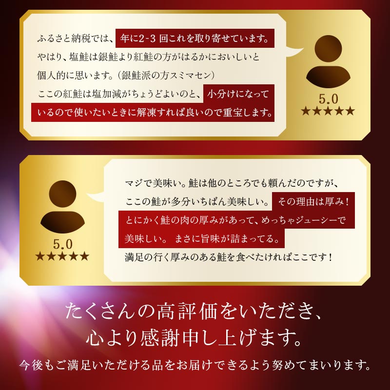 【選べる発送月】高評価★4.92 真空保存 天然厚切り紅鮭 3切×6パック 18切れ 甘塩仕立て 厚切り 3切れ ごとの真空 小分け 切り身 切身 北海道 釧路 ふるさと納税 鮭 サケ しゃけ 紅鮭 甘塩 天然 魚 魚介 海産物 冷凍