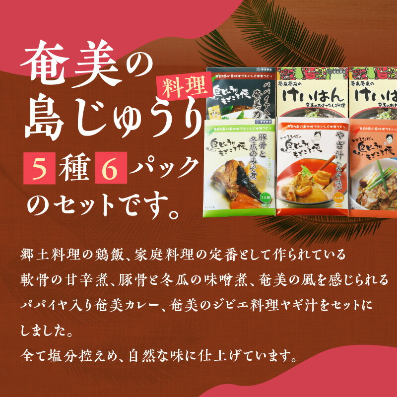 - 【ふるさと納税】 奄美の伝統 島料理 レトルト 6パック セット 奄美 惣菜 鶏飯 軟骨 甘辛煮 豚骨 冬瓜 みそ煮 ヤギ汁 パパイヤ カレー 伝統 料理 ジビエ 塩分控えめ ソウルフード おかず 三環舎 鹿児島 奄美市 おすすめ ランキング プレゼント ギフト