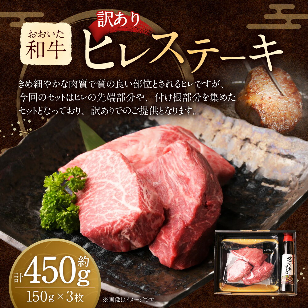【ふるさと納税】【訳あり】おおいた和牛 ヒレステーキ セット(先端、付け根) 約150g×3枚 計450g ステーキソース付き 牛肉 和牛 国産 肉 ヒレ 牛ヒレ ステーキ 赤身 3枚 九州 冷凍 大分 大分県産 竹田市 送料無料