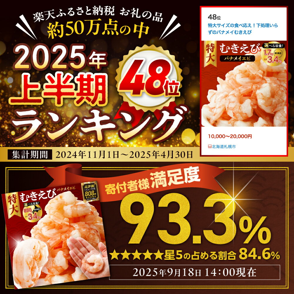 - 【ふるさと納税】 累計100,000件突破 ★【 選べる 容量 】 背ワタなし 特大 むきえび 5L サイズ 850g 1.7kg 2.5kg 3.4kg (解凍前) 下処理不要 エビ 冷凍 小分け えび ebi バラ おかず 弁当 海鮮 お取り寄せ 魚介 海老 ランキング 1袋 2袋 3袋 4袋 高評価 北海道 札幌市