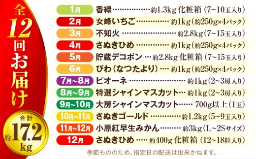- さぬき旬のフルーツ大満足 12回定期便| 果物定期便 フルーツ定期便 フルーツ 定期便 キウイ いちご 女峰 みかん 不知火 さぬきひめ デコポン びわ なつたより ぶどう ピオーネ シャインマスカット 定期便 12回 12ヶ月 果物 大房 さぬきゴールド 小原紅早生 化粧箱 香緑 香川 毎月配送|_mk006-t009d