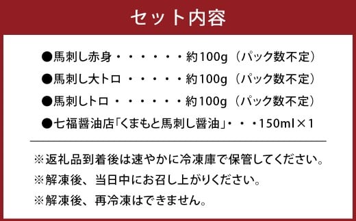 【阿蘇牧場】 阿蘇馬 馬刺し 3種 霜降り入( 赤身 大トロ トロ ) 約300g 専用醤油付き(150ml×1本) 馬刺し 馬刺 馬肉 馬 霜降り 専用醬油