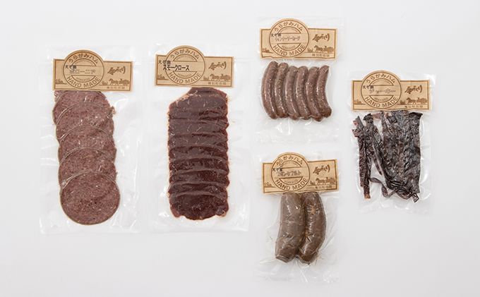 - えぞ鹿ソーセージ・ボロニア・ジャーキー 5種セット 計485g[うらがみミート] 無塩せき 保存料・結着剤不使用【ハム ソーセージ ウィンナー ベーコン 肉 鹿 国産 惣菜 おつまみ 料理 燻製 加工品 北海道 十勝 幕別 】